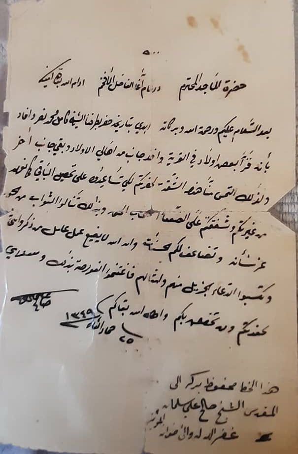 بعد السلام عليكم ورحمة الله وبركاته …. ابدي بتاريخه حضر بطرفنا الشيخ كامل محمد نصر وافاد بأنه قرأ بعض اولاد في القرية و أخذ جانب من اهالي الاولاد بقي جانب أخر ولذلك التمس منا هذه الثقة لحضرتكم لكي تساعدوه على تحصيل الباقي كما يعلم من غيرتكم وشفقتكم على الضعفاء أصحاب الحق وبذلك تنالوا الثواب من الحق عز شأنه وتُضاعف لكم الحسنات وان الله لا يضيع عمل عامل من ذكر وانثى وتكسبوا الدعاء الجزيل منهم وأمثاله فاغتنموا الفرصة بذلك وسلامي عندكم ولمن تحصن بكم وادام الله بقائكم