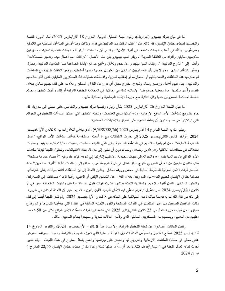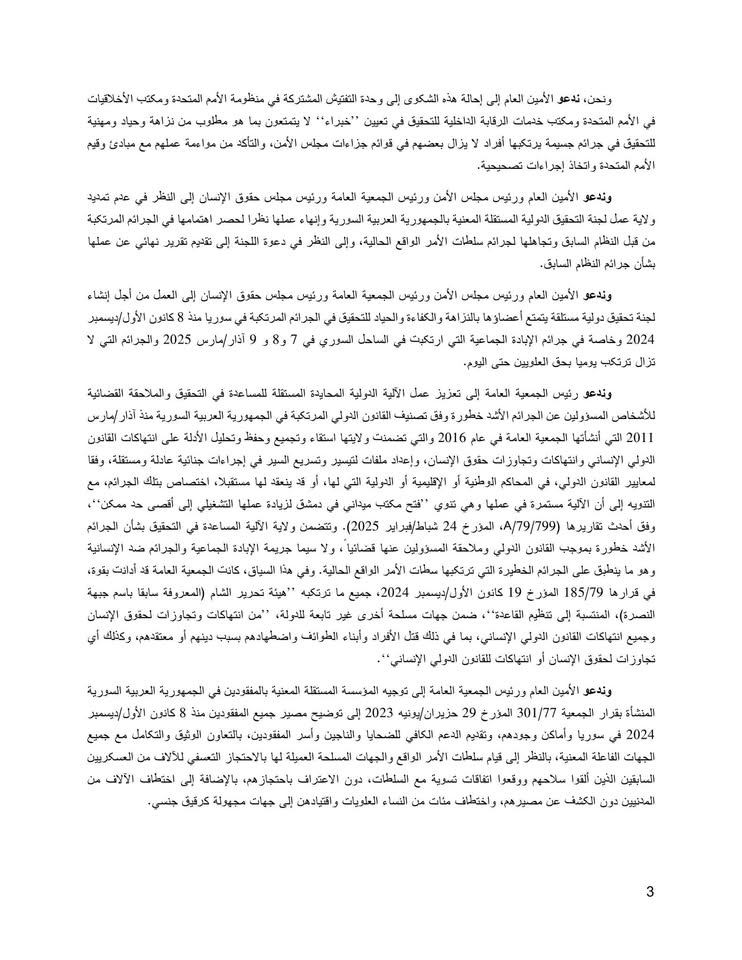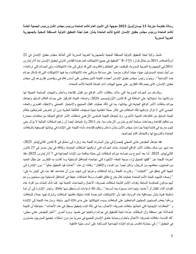وجهنا رسالة إلى الأمين العام للأمم المتحدة ورئيس مجلس الأمن ورئيس الجمعية العامة للأمم المتحدة ورئيس مجلس حقوق الإنسان التابع للأمم المتحدة، أبرزنا فيها العمل المتحيز والمسيس للجنة التحقيق الدولية المستقلة المعنية بالجمهورية العربية السورية التي أنشأها مجلس حقوق الإنسان في 22 آب/أغسطس 2011 وتجاهلها للمجازر والجرائم ضد الإنسانية التي ترتكبها سلطات الأمر الواقع من فلول القاعدة وداعش في سوريا. ودعونا إلى عدم تمديد ولاية اللجنة المذكورة وإغلاقها وإلى إنشاء لجنة تحقيق دولية مستلقة يتمتع أعضاؤها بالنزاهة والكفاءة والحياد للتحقيق في الجرائم المرتكبة في سوريا منذ 8 كانون الأول/ديسمبر 2024 وخاصة في جرائم الإبادة الجماعية التي ارتكبت في الساحل السوري في 7 و8 و 9 آذار/مارس 2025 والجرائم التي لا تزال ترتكب يوميا بحق العلويين حتى اليوم. ودعونا أيضاً إلى تعزيز عمل الآلية الدولية المحايدة المستقلة للمساعدة في التحقيق والملاحقة القضائية للأشخاص المسؤولين عن الجرائم الأشد خطورة وفق تصنيف القانون الدولي المرتكبة في الجمهورية العربية السورية منذ آذار/مارس 2011 التي أنشأتها الجمعية العامة في عام. ودعونا كذلك إلى توجيه المؤسسة المستقلة المعنية بالمفقودين في الجمهورية العربية السورية التي أنشئت في عام 2023 إلى توضيح مصير جميع المفقودين منذ 8 كانون الأول/ديسمبر 2024 في سوريا وأماكن وجودهم، وتقديم الدعم الكافي للضحايا والناجين وأسر المفقودين، بالتعاون الوثيق والتكامل مع جميع الجهات الفاعلة المعنية. ويمكن الاطلاع على الرسالة في مرفق هذا المنشور.